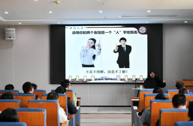 谭鑫博士从“营造温暖氛围”“进行有效沟通”“加强彼此信任”“持续思想引领”和“播种希望种子”五个方面,结合丰富案例,深入浅出地阐述了辅导员如何与学生建立信任、实现有效沟通,并帮助学生解决学业、情感及生活中的实际问题。为让大家深刻体会“换位思考”在谈心谈话中的重要性,谭鑫博士还在讲座过程中设计了生动有趣的互动环节,现场气氛热烈,感染力十足。