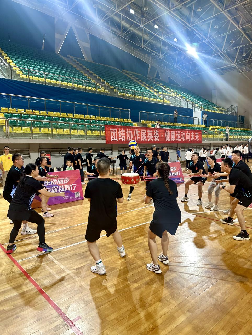 本次联赛以“工学互动,健康你我”为主题,共有10支代表队参赛。比赛分“龙行天下”“共筑梦起”“雷霆战鼓”“力拔山河”“呼拉圈拉力”等五个项目,每个项目均需团队成员的高度协作配合才能制胜。“龙行天下”项目中,我院12名队员随着统一口号同步小跑加速前行,以极强的节奏感和把控力,获得此项目第2名。“呼拉圈接力”项目则充满欢声笑语,队员们灵活穿梭快速传圈,流畅的配合完成接力,并获得此项目的第3名。“雷霆战鼓”项目,队员们合力拉紧鼓绳,目光紧盯小球,通过细微调整力度与方向,实现连续颠球60个的好成绩。最终,我院代表队以团体总分第五名的成绩获得团体三等奖。