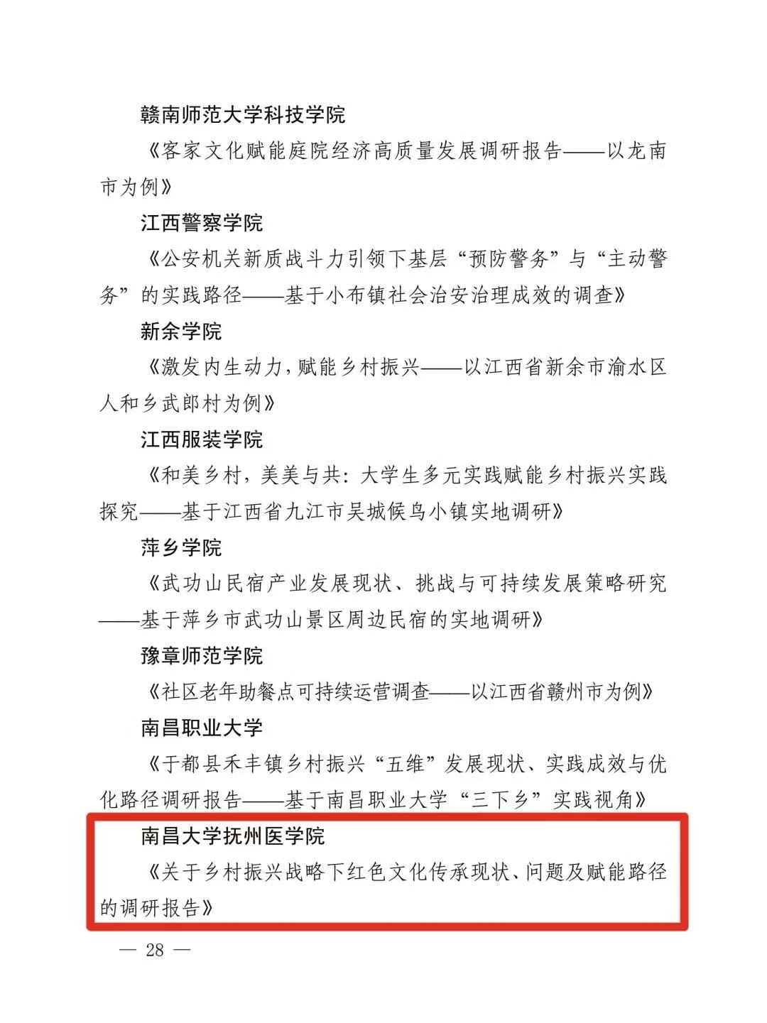 近日,省委宣传部、省教育厅、团省委、省学联联合下发表彰通报,公布2025年江西省大中专学生志愿者暑期文化科技卫生“三下乡”社会实践活动获奖名单,我院在此次评选中荣获多项荣誉。“青衿筑梦·赋能兴乡”暑期社会实践队与“傩艺传薪·非遗焕彩”暑期社会实践队获评“优秀团队”,曾蕊、毛源灏、章志超三名同学获评“优秀个人”,《关于乡村振兴战略下红色文化传承现状、问题及赋能路径的调研报告》获评“优秀调研报告”。